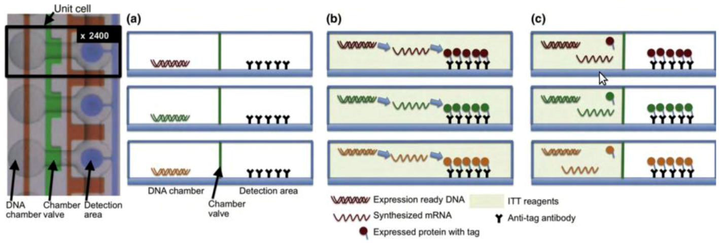 DNA to protein arrays microfluidic platform. (a) DNA templates are enclosed on each unit chamber, while the detection area contains immobilized antibodies. (b) To generate the DNA to protein array (DTPA) the device is loaded with the in vitro transcription/translation (ITT) reaction mixture, allowing for protein synthesis to occur. (c) The detection area is washed to remove any ITT leftovers, and the protein array is now ready for further analysis. Reprinted with permission from [123], Copyright (2010) Elsevier Ltd.