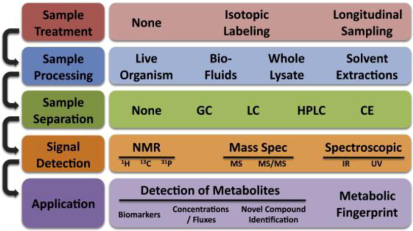 The typical workflow for single cell metabolomics analysis. Multiple experimental steps are involved in the metabolomics study, each one with different possible methodologies. Reprinted with permission from [128], Copyright (2010) Elsevier Inc.