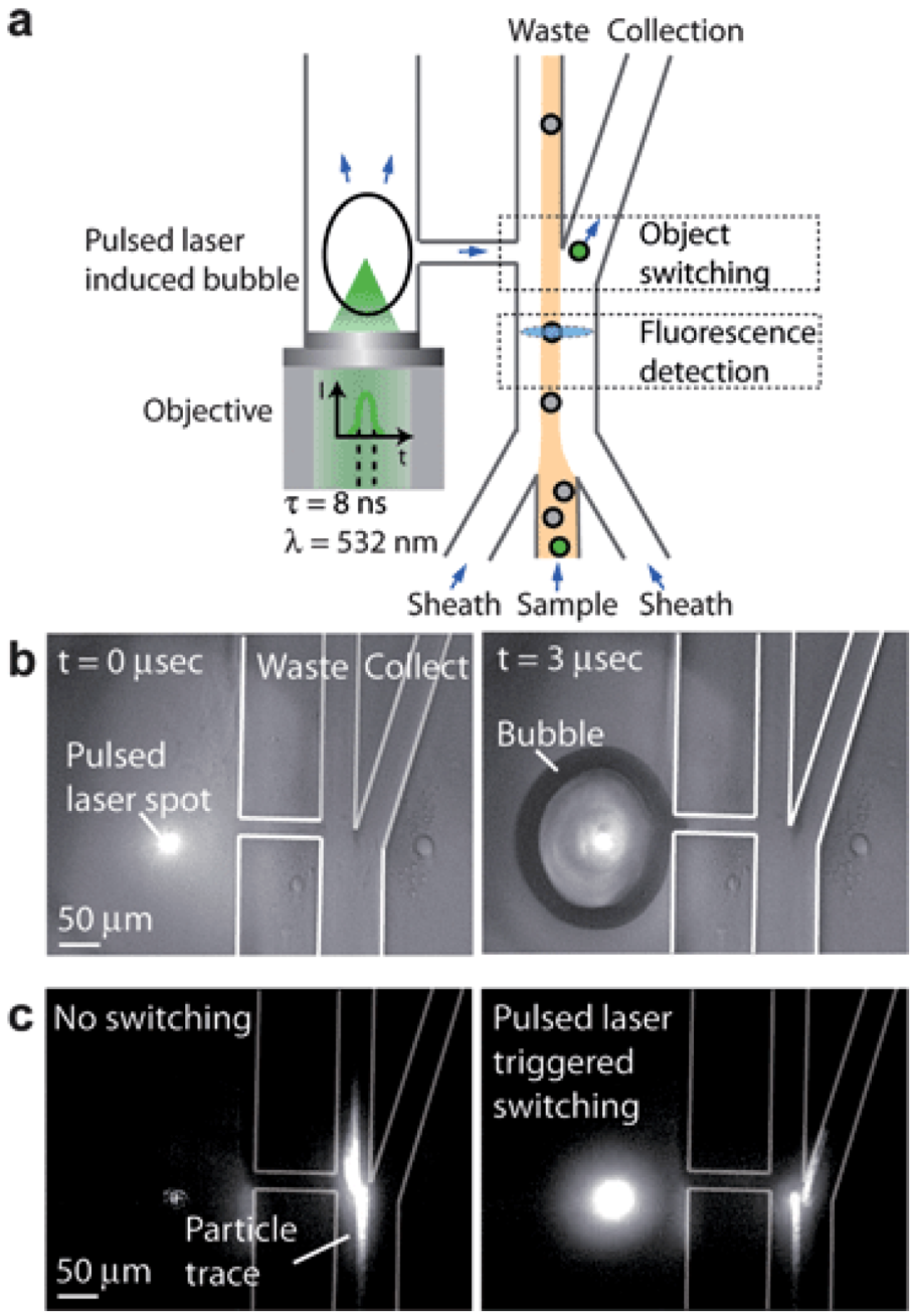 - Wu, T.H.; Chen, Y.; Park, S.Y.; Hong, J.; Teslaa, T.; Zhong, J.F.; Di Carlo, D.; Teitell, M.A.; Chiou, P.Y. Pulsed laser triggered high speed microfluidic fluorescence activated cell sorter. Lab Chip 2012, 12, 1378–1383. [Google Scholar] [CrossRef]