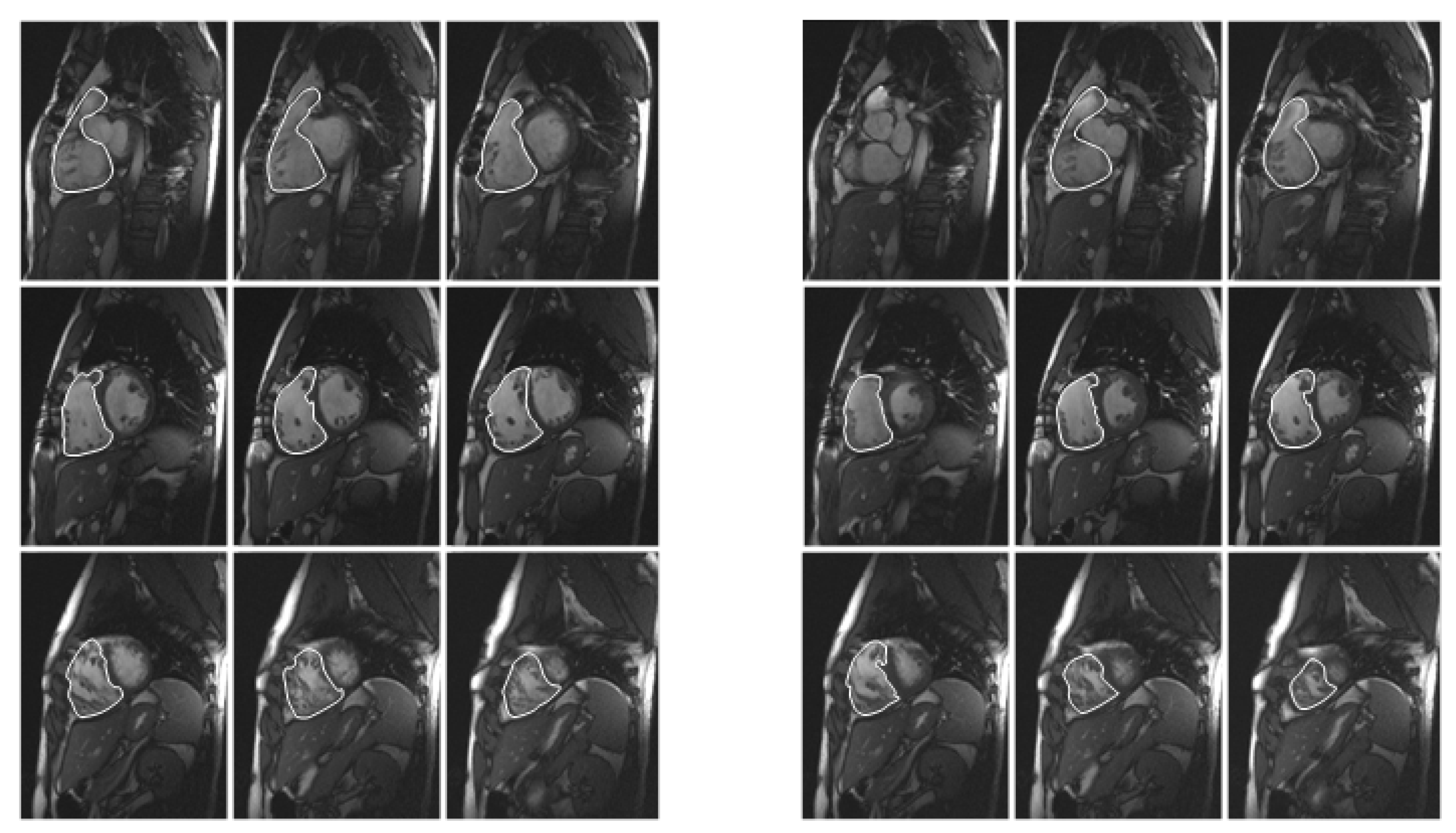 - Sardanelli, F.; Quarenghi, M.; di Leo, G.; Boccaccini, L.; Schiavi, A. Segmentation of cardiac cine MR images of left and right ventricles: Interactive semiautomated methods and manual contouring by two readers with different education and experience. J. Magn. Reson. Imag. 2008, 27, 785–792. [Google Scholar] [CrossRef]