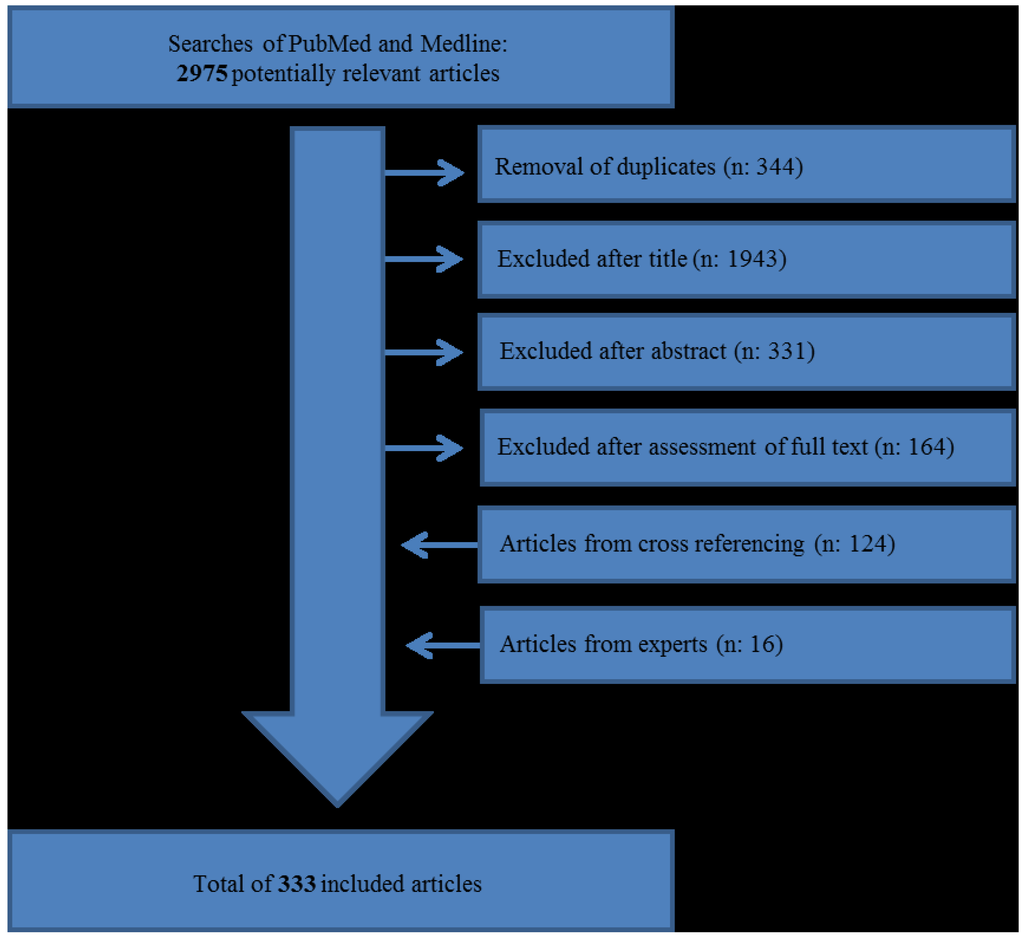 Final searches were conducted on 12 December 2014 and resulted in 2631 articles after the removal of duplicates. Articles were excluded after title (n = 1943), after abstract (n = 331) and after evaluation of the full text (n = 164), resulting in 193 chosen articles. For inclusion, articles were to be specific for GEP-NECs or specific for GEP-NENs with relevance to GEP-NECs. Exclusion criteria were articles without relevance to GEP-NECs, articles not specific to humans, articles written in languages other than those mentioned, case studies with n ≤ 5, in vitro studies, reviews published before 2010, editorials, letters, commentary, abstracts, highlights from conferences and articles specific for hereditary diseases (MEN-1 etc.). Chosen articles were cross-referenced and articles from experts within the field were also evaluated for inclusion, which resulted in a final total of 333 articles, creating the basis of this review (as shown in Figure 1). The final reference list was produced based on the originality and relevance of articles.