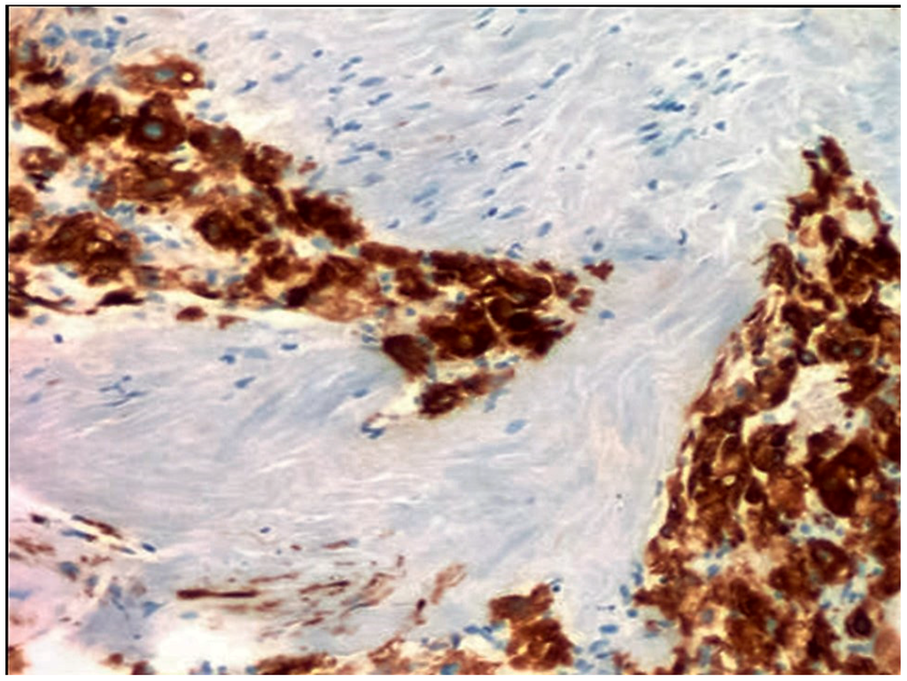 Expression of keratin 7 in fibrolamellar variant of hepatocellular carcinoma (K7 immunohistochemical staining, ABC, original magnification 100×).