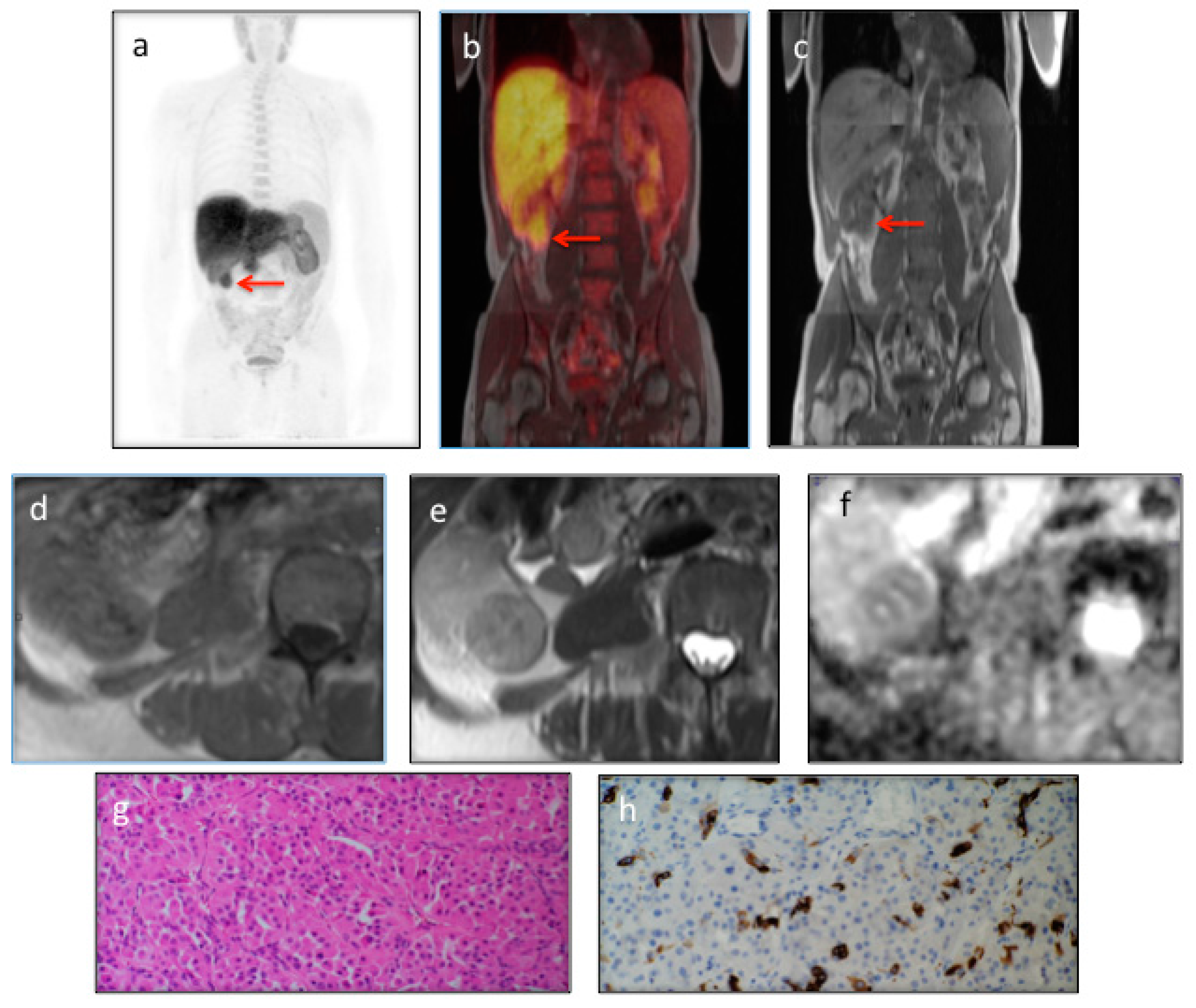 PET/MRI is a new hybrid imaging modality, which has recently been introduced into clinical practice [1]. We present a 79 year-old gentleman with a past history of prostate cancer Gleason 6 (3 + 3) treated with brachytherapy who underwent a re-staging 18F-Choline PET/MRI scan following a rise in PSA (4.07, nadir 1.3). Apart from an abnormal focus at the base of the left seminal vesicle, which was suspicious for disease recurrence, the 18F-Choline PET/MRI showed intense tracer uptake within a solid 34 mm right lower pole renal mass (a–c, red arrows), with MRI features typical for an oncocytoma: iso/hypo intense signal on T1-weighted (d); hyperintense on T2-weighted (e); and central area of low signal intensity on both T1-weighted and T2-weighted images suggestive of a central scar (d,e); The lesion appeared hindered on high b value (b-value = 900 s/mm2) diffusion weighted sequences (f). A right laparoscopic radical nephrectomy was performed subsequently. Macroscopically, a lower pole tan-coloured tumour was present. Sections of the tumour showed an encapsulated lesion comprised of packets of oncocytic cells staining positively for CK7, in keeping with an oncocytomas (g (200× magnification) and h (400× magnification)). The differentiation of an oncocytoma from other solid renal lesions, in particular renal cell carcinoma (RCC), is a diagnostic challenge [2]. MRI is frequently used for the detection and differentiation of renal masses, including oncocytomas. However the specificity of MRI is reduced since the features of oncocytomas show considerable similarities with those of RCCs [3]. Diffusion-weighted imaging (DWI) can augment MRI characterisation of renal lesions, but there is an overlap in the ADC values of RCCs and oncocytomas. Different authors have shown that malignant renal tumours have lower ADC values when compared to benign tumours such as oncocytomas [4]. However, other studies have demonstrated similar ADC values for these two tumour types [5]. PET/MRI maximises the diagnostic information available. This particular case demonstrated its value in the characterisation of an incidental renal lesion, thus avoiding the need for further diagnostic tests and potentially reducing unnecessary surgical resections. Choline-avid oncocytomas have not been described before, but cannot be differentiated from renal cell carcinomas on the PET characteristics alone. The addition of MRI features led to a confident PET/MRI diagnosis of an oncocytoma. All procedures performed in this study were in accordance with the ethical standards of the institutional and/or national research committee.