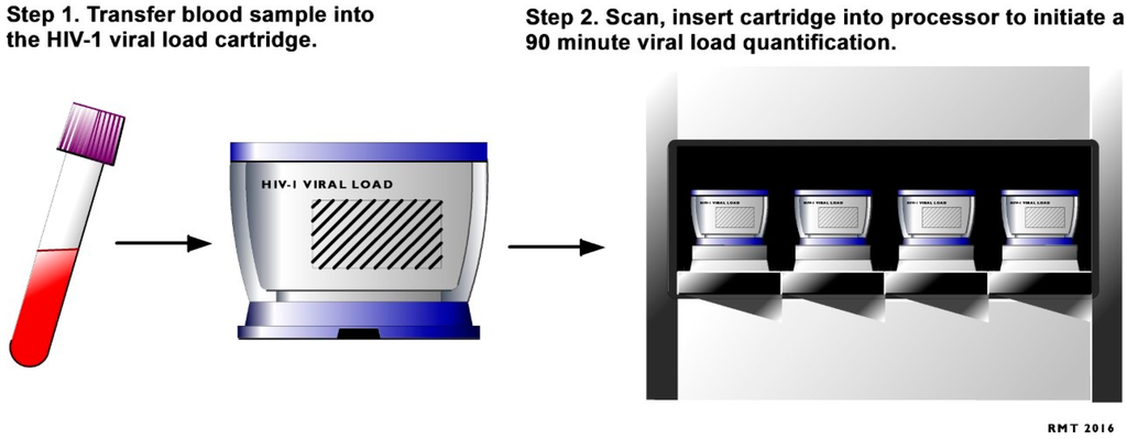 HIV viral load monitoring is recommended by WHO as the principal test for efficacy of ART treatment, and to determine if HIV positive women should have a C-section rather than a vaginal delivery []. An elevated HIV viral load (>1000 IU/mL) can put infants at risk of HIV transmission and other T-cell related abnormalities during the birth process []. HIV viral load monitoring is currently provided by laboratories and requires plasma samples in most resource-limited settings. Improving access to viral load testing to antenatal clinic though the introduction of POC HIV viral load tests, such as the recently approved Xpert® HIV-1 VL [], can improve early detection of drug resistance in rural antenatal clinic that have poor access to laboratory infrastructure. POC viral load testing can also enable timely diagnosis of acute HIV infection at clinics where patients at high risk can then receive care []. Use of POC viral load in these settings has the potential to enhance the effectiveness of PTMCT programs in order to meet the United Nations treatment target to achieve viral suppression in 90% of people on ART by 2020 and end the AIDS pandemic []. Patient-centered benefits of the emerging semi-quantitative POC viral load assays, which detect HIV RNA using a lateral flow dipstick with a novel isothermal amplification technique, has been demonstrated []. The need for POC HIV viral load diagnostics has been highlighted in SA [], with simple testing being key to enabling the implementation of POC HIV viral load technologies to remote or resource limited settings []. A new fully automated real-time molecular-based HIV-1 VL POC test, Cepheid GeneXpert® (Xpert, Sunnyvale, CA, United States) HIV-1 viral load (VL) assay received European CE-IVD regulatory approval in December 2014 []. The Xpert HIV-1 VL POC test has recently been validated for use in clinical settings in South Africa []. This is an easy to use test which, enables RNA extraction, purification, reverse transcription and cDNA real time quantitation in one fully integrated cartridge and produce results in less than two hours (Figure 2) []. The results of the validation showed that the Xpert® HIV-1 VL has good correlation with an established laboratory based viral load assay. This demonstrates that the Xpert® HIV-1 VL POC test could be a reliable tool for clinic-based viral load monitoring in clinical settings in South Africa []. These results are important and a first step to implementation of HIV VL POC testing in South Africa.