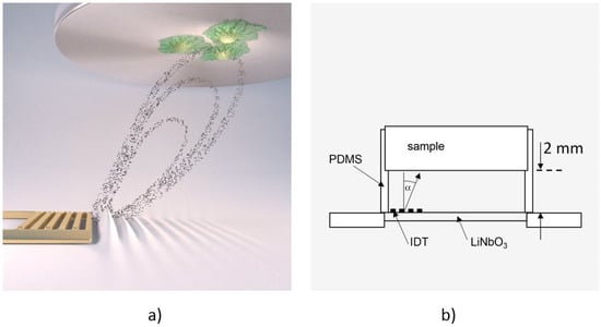 (a) Computer animation of the De-Adhesion Number Investigator (DANI) setup showing the acoustic streaming in the chamber towards the substrate with adhered cells (indicated by the black dots) that is generated by the interdigital transducer (IDT) (gold, comb-like structure) (by courtesy of C. Hohmann, Nanosystems Initiative Munich (NIM)); (b) Schematic drawing of the same setup. The IDT is located on the LiNbO3 chip inside the polydimethylsiloxane (PDMS)-chamber, which holds the substrate 2 mm above the chip. The fluid flow induced by the SAW is directed towards the cell substrate under an angle of α = 21°.