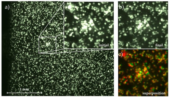 Comparing the following images to this initial state, we determined the migration of cells on the substrate (area covered with cells at but not at t0) and their detachment (area covered with cells at t0 but not at ) time-dependently, ending up with . Figure 2 visualizes this image analysis process. The magnified images show the initial and final state as well as their superposition created with the colocalization finder macro for ImageJ [26]. In the superposition, the yellow cells remain at their positions throughout the whole experiment, while spots where cells have been detached are labelled with red and cells that appear in the final image but not in the initial one and thus must have moved on the substrate are shown in green.