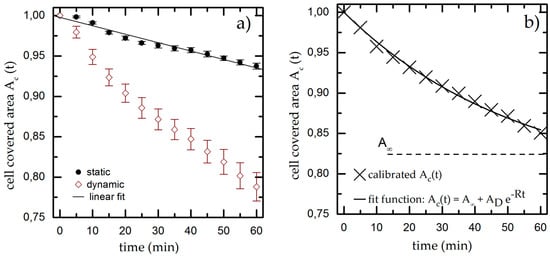 (a) Cell covered area over time under static and dynamic conditions for T = 37 °C, pH = 7.4 and Rq = 3.76 µm. We fit a linear function to the static results (black line) and use it as calibration baseline to decouple the shear-induced detachment from the effects of gravity and bleaching. The data points and error bars show the mean and standard deviation respectively from n ≥ 5 measurements; (b) Dynamic measurement from (a) normalized to the linear fit extracted from the static experiments.