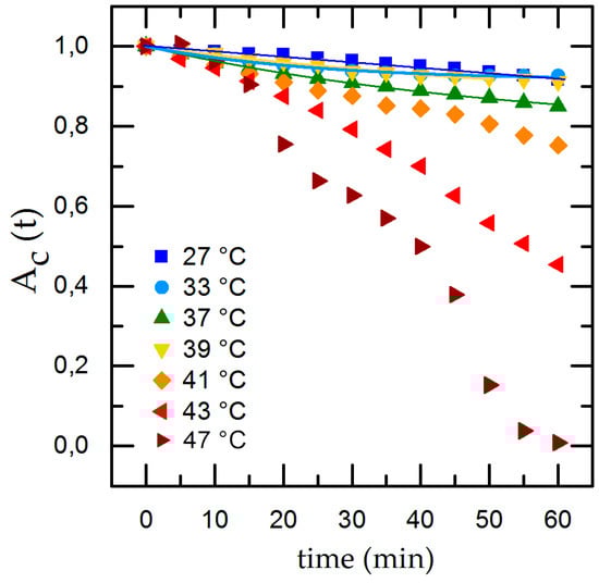 To compare the individual changes during shear flow exposure we normalize the time-dependent cell adhesion to the initial adhesion and show the results with applied shear flow in Figure 4. Under dynamic conditions we find an exponential decrease of the cell covered area Ac,t with time. Applying our rate model (Equation (2)) for temperatures inside the physiological range (33 °C ≤ T ≤ 41 °C), we can calculate the detachment rate R and , whereas going to extreme conditions (T = 27 °C and T ≥ 43 °C), the rate model collapses. At T = 27 °C we find only minor cell detachment in the beginning and an increase of cell detachment at t = 40 min as well as a final cell covered area of 0. This is no reasonable result and is due to the flat slope and the concomitant large error of the fit. At T = 43 °C Ac,t shows an almost linear decrease and, after t = 40 min, an abrupt decline. For T = 47 °C we find the same effect but with a stronger decline and no remaining cells on the substrate for t = 60 min. The abrupt change of the detachment rate prohibits to fit Equation (2) to the data.