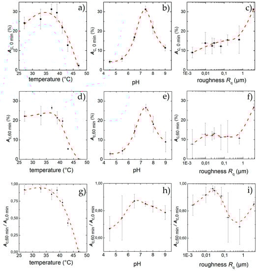 As mentioned above, inflammatory conditions can lead to changes in temperature and pH. Therefore, we examined in the following cell detachment under static and dynamic conditions and vary temperature, pH as well as the surface roughness. We studied their respective influence and find the results shown in Figure 4 and Figure 5. We individually compared the static result in terms of the initial adhesion Ac,0 min as well as the dynamic results in terms of the final adhesion Ac, 60 min and the normalized final adhesion Ac,60 min/Ac,0 min as a function of temperature (Figure 5a,d,g), pH (Figure 5b,e,h) and surface roughness (Figure 5c,f,i), respectively.