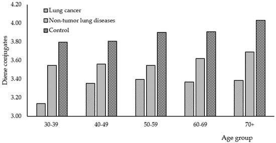 The levels of diene conjugates in the saliva decrease by 8.5% when going from the control group to patients with non-malignant pulmonary pathology, and then, when going to patients with lung cancer (3.89, 3.59, and 3.33 units are average values for each group, respectively). The described changes are common for all age groups included in the study. Insufficient levels of lipid peroxidation products might result from the tumor tissue’s resistance to peroxide initiators and the modified functioning of the enzyme systems that regulate lipid peroxidation [31,32].