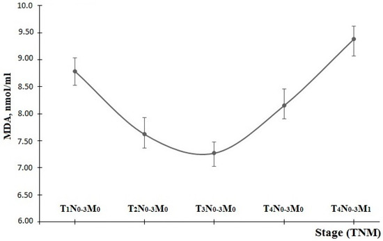 The dynamics of the MDA level depending on the disease stage show a gradual decrease from 8.79 ± 0.19 nmol/mL at the first stage to 7.27 ± 0.16 nmol/mL at the third stage. Then, there is an intensive growth in this parameter of up to 9.38 ± 0.2 nmol/mL in the context of metastatic lesions (Figure 5).
