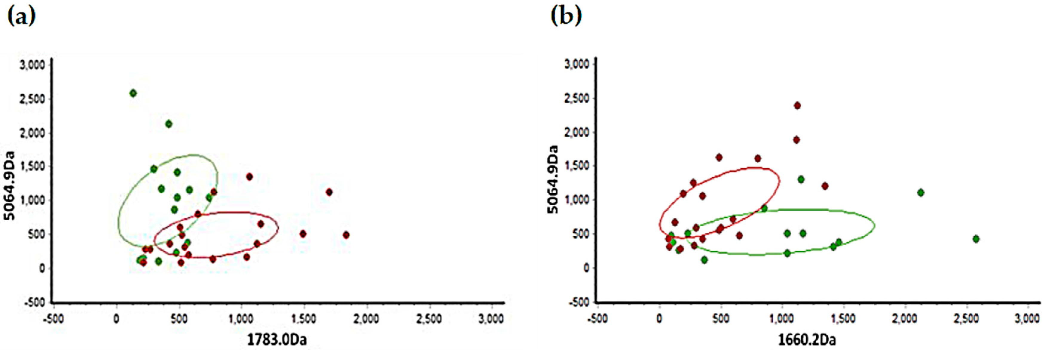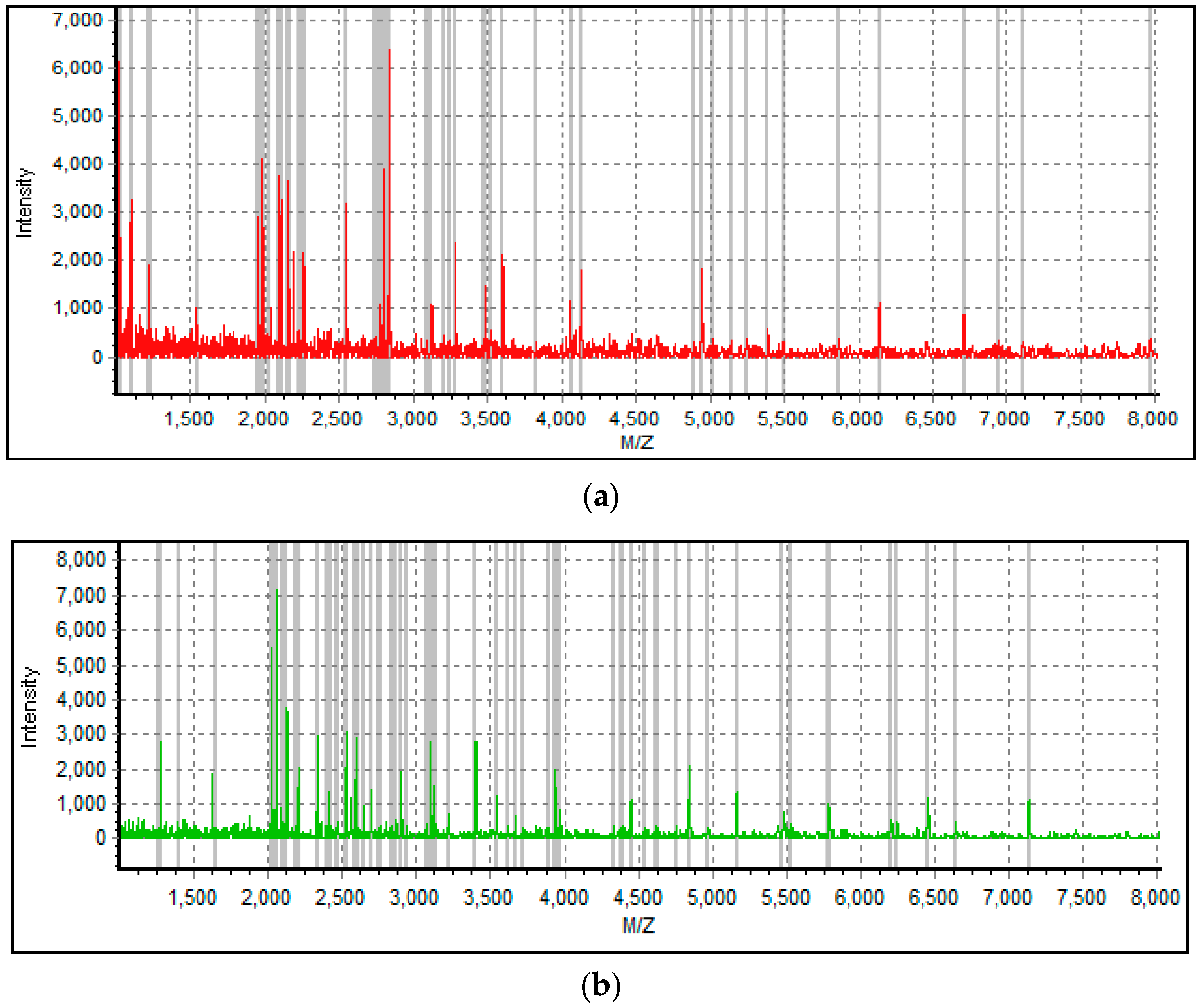 - Preianò, M.; Maggisano, G.; Lombardo, N.; Montalcini, T.; Paduano, S.; Pelaia, G.; Savino, R.; Terracciano, R. Influence of storage conditions on MALDI-TOF MS profiling of gingival crevicular fluid: Implications on the role of S100A8 and S100A9 for clinical and proteomic based diagnostic investigations. Proteomics 2016, 16, 1033–1045. [Google Scholar] [CrossRef] [PubMed]
