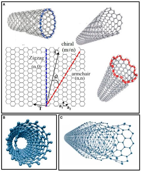 Structure and models of carbon nanotubes in function of their number of walls. (A) Single-wall carbon nanotubes (SWCNTs) structures in function of their chirality (zigzag, armchair, and chiral); (B) double-walled carbon nanotubes (DWCNTs); and (C) multi-walled carbon nanotubes (MWCNTs) made up of several concentric shells. Reprinted from [7] with permission. Figure as originally published in Tîlmaciu, C.-M.; Morris, M.C. Carbon nanotube biosensors. Front. Chem. 2015, 3, 59. doi:10.3389/fchem.2015.00059.
