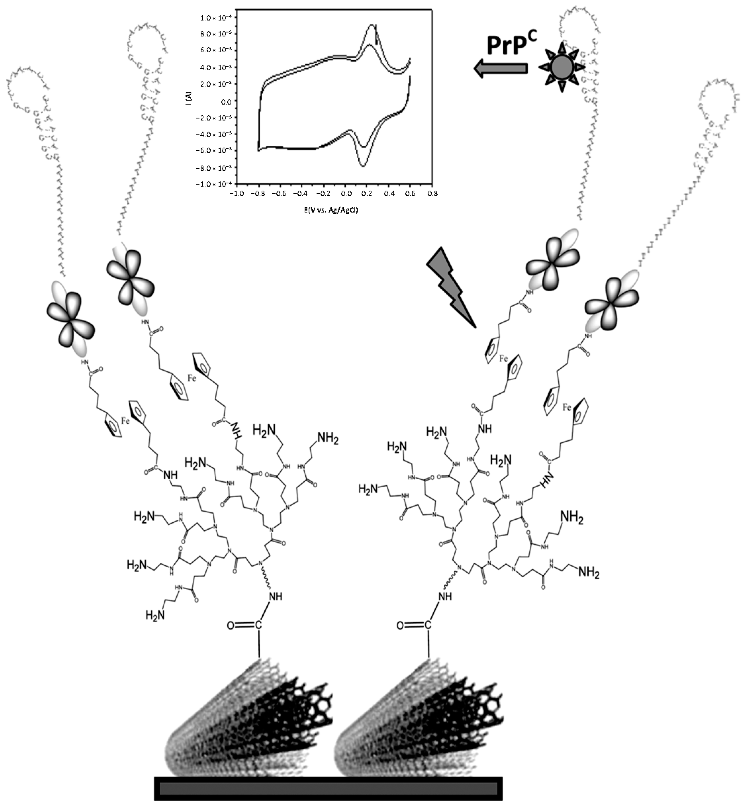 Prion proteins are responsible for the transmissible spongiform encephalopathies (TSEs), a group of fatal neurodegenerative diseases including Creutzfeldt-Jakob disease in human and spongiform encephalopathy in animals [25]. These highly contagious diseases are caused by transformation of cellular prions (PrPC) into their infectious isoform PrPSc, which are resistant to protease digestion and have a tendency to form large aggregates and form amyloid plaques in brain of mammals. Miodek et al. [26] developed an electrochemical aptasensor for human PrPC protein determination using MWCNTs modified with dendrimers (Figure 2). This approach involved covalent attachment of polyamidoamine (PAMAM) G4 dendrimer to the MWCNTs adsorbed on the surface of a gold electrode. Subsequently, the redox marker ferrocene (Fc) modified with two phtalamido groups (Fc(NHP)2) was covalently attached to the PAMAM G4 by the amide link, following by covalent bonding of biotin hydrazide on the remaining phtalymidyl esters of the Fc moieties. Biotinylated aptamers were finally immobilized after streptavidin binding to the biotinylated bioscaffold. Electrochemical signals were obtained by cyclic voltammetry (CV) with the peak currents corresponding to the ferrocenyl redox marker incorporated between the dendrimers and aptamers interlayer. The peak current decreased with the PrPc concentration which was attributed to the lower electron transfer from the ferrocenyl group to the surface due to the decrease of permeability of the sensing layer caused by attachment of the prion proteins to the surface. A LOD of 0.5 pM and a wide detection linear range from 1 pM to 10 μM were achieved for prion protein. The feasibility of this approach for detection of PrPC in spiked blood plasma was also demonstrated.