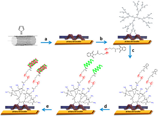 Schematic representation of the steps involved in the biosensor developed for Mycobacterium tuberculosis rpoB gene using MWCNTs-PPy-PAMAM-Fc composite nanomaterial. Steps: (a) electropolymerization by cycling potential; (b) dendrimers attachment through electrochemical oxidation of PAMAM’s G4 amines; (c) Covalent attachment of ferrocene; (d) covalent attachment of DNA (wavy lines in green), bearing amine in 5′-position, in PBS at room temperature; (e) hybridization reaction with the DNA target (wavy lines in red). Reprinted from [8] with permission.