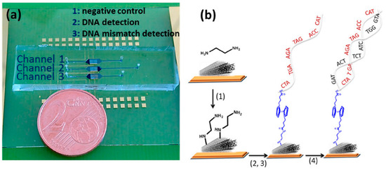 Zribi et al. [16] developed a microfluidic-multiplexed electrochemical platform for direct impedimetric DNA detection without any amplification of Hepatitis C viral DNA and Mycobacterium tuberculosis genomic DNA in clinical isolates. The developed monolithic chip integrated three independent fluidic polydimethylsiloxanes (PDMSs) channels, each containing one electrochemical chamber with three gold electrodes. The working electrode was functionalized with MWCNTs and Fc (Figure 4). Through electrochemical impedance spectroscopy (EIS) measurements in the presence of [Fe(CN)6]4−/3− probe, the resulting miniaturized microfluidic device allowed a LOD of 7 fM for a synthetic ss-oligonucleotide from Hepatitis C virus with a large dynamic range from 0.1 fM to 1 pMas as well as a selective direct detection of a Mycobacterium tuberculosis (H37Rv) rpoB allele in DNA extracted from clinical isolates without PCR amplification.