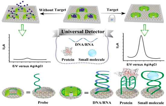 Schematic illustration of the target-responsive encapsulation assay (TRE) electrochemical biosensor for determination of various classes of biologically relevant molecules. Reprinted from [21] with permission.