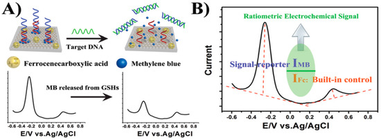 Schematic illustrations of the ratiometric electrochemical DNA sensor developed (A); and the electrochemical signal obtained (B). Reprinted from [12] with permission.