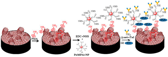 Cardiac troponins consist of a complex of troponin C (TnC), troponin I (TnI) and troponin T (TnT) that regulates the contraction of striated and cardiac muscle. Both cTnT and cTnI are recommended markers for evaluation of acute coronary syndrome, whereas cTnC is unspecific. The existence of multiple forms of cTnI and their low stability makes the application of analytical procedures difficult. In addition, relatively small differences in cTnI concentrations have been described between health and disease conditions. Levels of cTnI in healthy humans are normally lower than 0.1 ng·mL−1 whereas values between 0.1 and 2 ng·mL−1 suggest a diagnosis of unstable angina and other heart disorders and levels greater than 2 ng·mL−1 indicate an increased risk for future serious heart events [59]. Therefore, monitoring of these biomarkers for diagnostic purposes requires the use of highly sensitive and accurate detection systems. An interesting example is the preparation of an immunosensor for the determination of cTnI by coating a GCE with a GR-MWCNTs hybrid film. This type of composite combines the large specific surface area and three-dimensional framework of CNTs with the high edge-density of GR, and exhibits synergistic effects between both different graphitic nanostructures [60]. In the reported configuration, the resulting hybrid was modified with platinum nanoparticles that were capped with mercaptopropionic acid (MPA) and anchored on the GR-MWCNTs film via the self-assembled cross-linker 1-pyrene-methylamine (PMA) (Figure 7). The resulting surface provided site specific immobilization with high loading of anti-cTnI antibodies for label-free cTnI immunosensing using EIS [61].