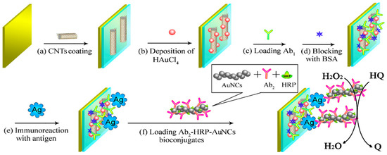 Scheme of the fabrication steps o fNT-proBNP immunosensor using AuNCs-HRP-Ab2 and AuNPs-CNTs nanocomposites. Reprinted from [74] with permission.