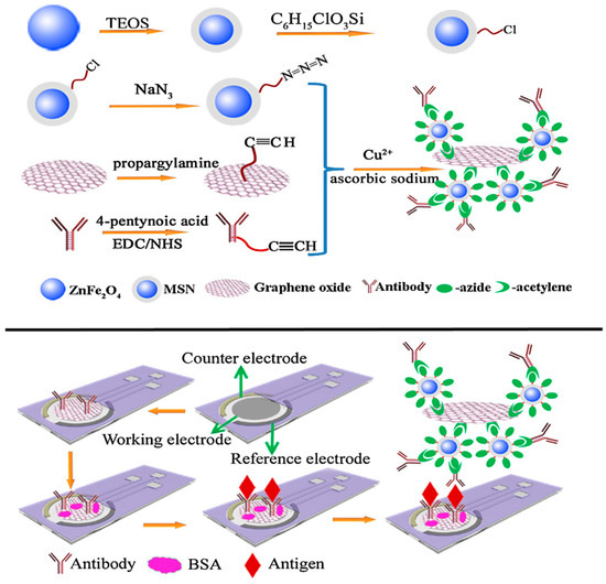 The use of label-free detection minimizes complicated and time-consuming procedures, and also facilitates the design of miniaturized highly portable equipment for POC devices. For instance, the detection of the important breast cancer biomarker CA 15-3 was accomplished by Li et al. [81] by preparing a sensitive and reliable immunosensor involving the use of GCEs modified with N-doped graphene sheets (NGS) as a platform for electrochemical detection. Anti-CA 15-3 antibodies were covalently attached to NGS surface through the carboxylic groups of this material and [Fe(CN)6]3−/4− was used as the redox probe. In this configuration, the high conductivity of the modified electrode in which NGS significantly promoted electron transfer resulted in a greatly amplified signal with no need for tracer labels. Another immunosensor for the detection of CA 15-3 was fabricated by using click chemistry [82]. As is known, copper(I) catalyzed azide-alkyne cycloaddition (“click” chemistry) has emerged as an efficient strategy for biomolecule immobilization. Some advantages for this reaction are the high yields, no by-products, and moderate conditions, as well as the possibility to be performed in aqueous and physiological conditions. In this work, a copper-catalyzed 1,3-dipolar cycloaddition reaction was used to prepare magnetic silica nanoparticles/GO composites (MSNPs/GO) by conjugation of azide-functionalized magnetic silica nanoparticles to alkynyl-functionalized GO (Figure 9). The resulting nanomaterial exhibited a high peroxidase-like activity and, compared with conventional enzyme labels, it exhibited the advantages of environmental friendliness and improved stability. For construction of a label-free immunosensor, disposable screen-printed electrodes modified with GO were used to covalently link monoclonal anti-CA 15-3 antibody, with MSNPs/GO enzyme-like composites acting as the signal labels.