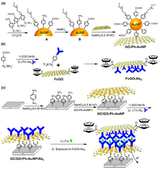 For the detection of cTnI cardiovascular biomarker in the early diagnosis of myocardial infarction, a stable label-free amperometric immunosensor was recently reported involving AuNPs and GO nanocomposites covalently anchored onto GCEs by aryldiazonium salt coupling using 4-phenylenediamine (Figure 10). AuNPs were previously modified with mixed layers of 4-nitrophenyl, 4-carboxyphenyl, and polyethylene glycol (PEG). These functions were used for linking AuNPs to GO surface and to covalently immobilize the capture antibody. Moreover, the presence of PEG groups helped to avoid nonspecific adsorptions. The resulting platform (GO-Phe-AuNPs) had a large surface and provided a high stability to the sensing interface. Furthermore, a signal amplification strategy for the determination of cTnI was implemented by immobilizing the detector antibody on GO tailored with ferrocene, thus functioning as the signal reporter [87].