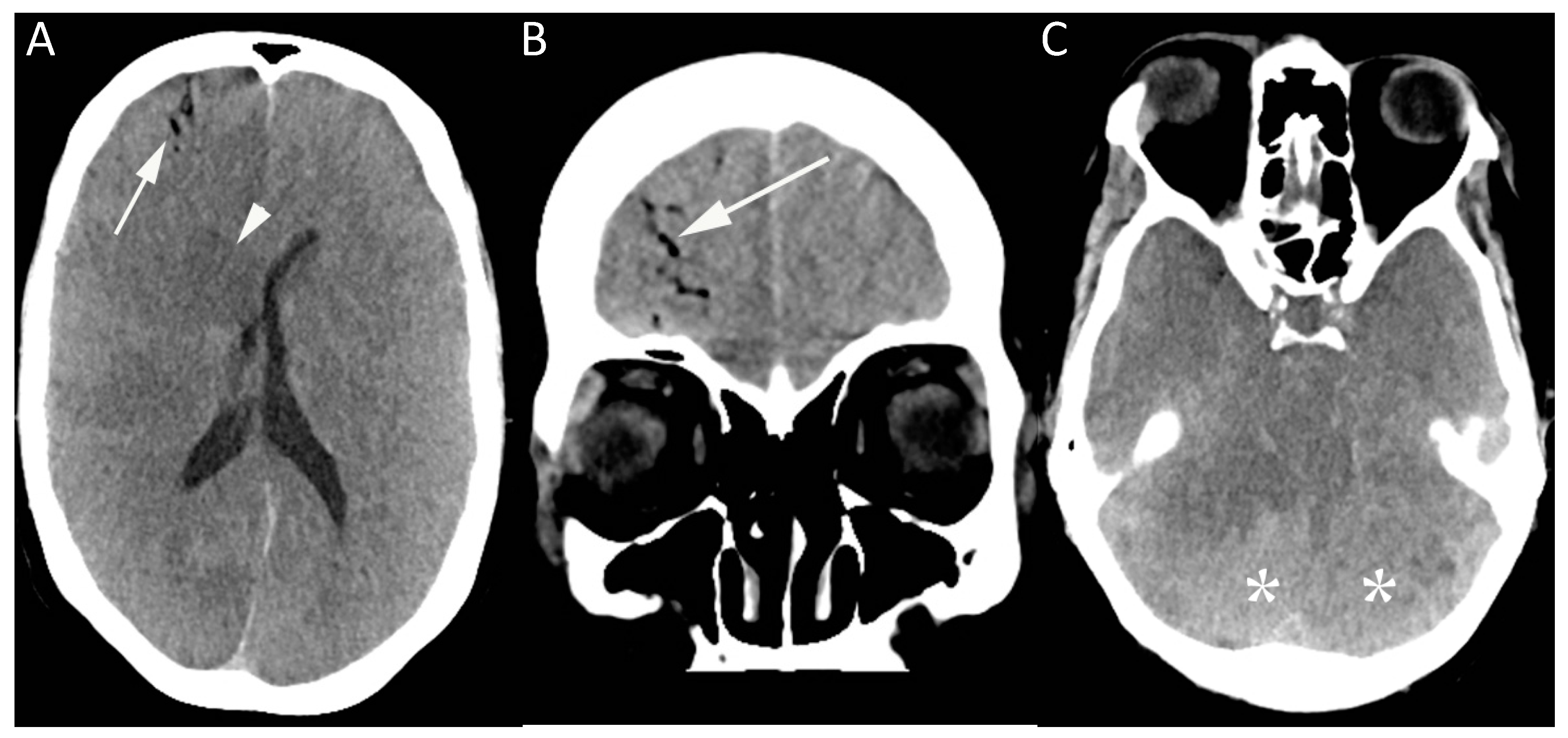 This image shows a computed tomography (CT) brain of a 50-year-old female in the medical intensive care unit who became unresponsive shortly after removal of an internal jugular line. CT brain (A–C) was performed showing gas within the right frontal lobe in distribution, suggesting an intravascular location (arrow, A and B), together with diffuse loss of gray-white matter differentiation, most prominently in the central deep nuclei (arrowhead). There was evidence of mass effect, with effacement of the basal cisterns (C), and the dense cerebellum sign (*) related to relative sparing of the cerebellar hemispheres.