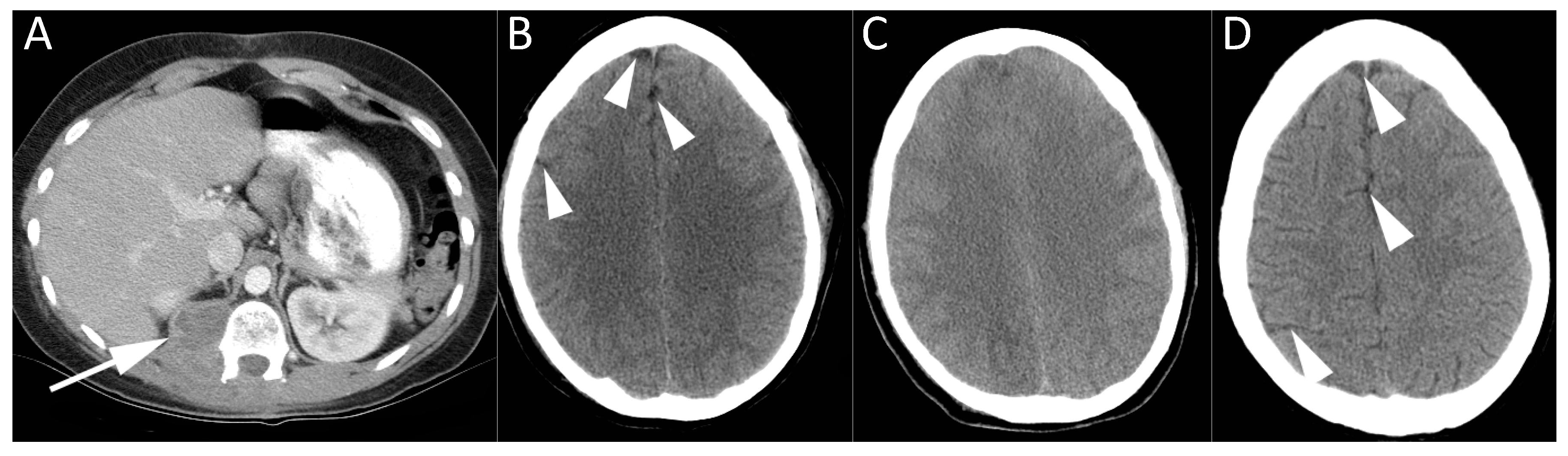 CT imaging of a 20-year-old female with paraspinal tumor seen on axial contrast enhanced CT (A). She became profoundly hypotensive during spinal surgery for resection of this malignant nerve sheath tumor. Air was noted in an infusion bag. CT brain at baseline (B) was normal, revealing normal volume of cerebrospinal fluid (CSF) around the cerebral hemispheres (arrowheads). Serial CT studies of the brain performed over the coming days revealed progressively worsening cerebral edema. CT brain at three days (C) shows effacement of CSF and diffuse cerebral swelling. She was managed with hyperbaric oxygen treatment and an intracranial pressure monitor was placed. CT brain performed 19 months later showed essentially normal appearances of the brain (D), with return of normal CSF spaces (arrowheads). The patient recovered from the air embolism, but died 25 months later from metastatic disease.