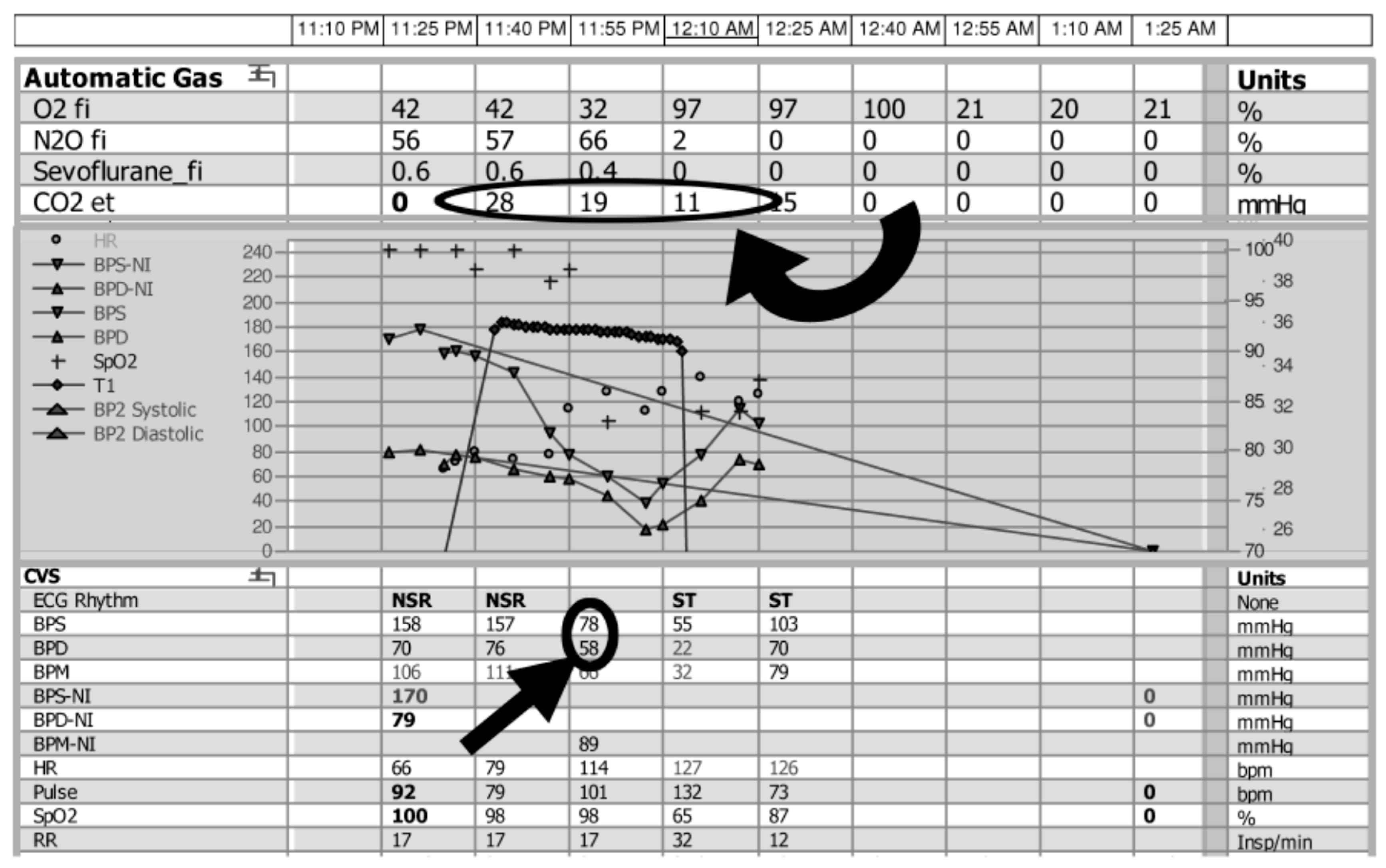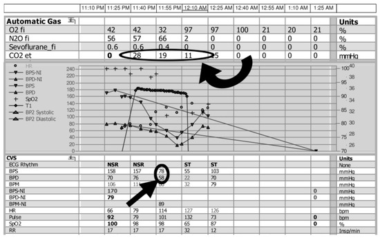 Changes in end-tidal CO2 monitoring during intraoperative air embolism from the anesthesia record of a 76-year woman undergoing hemicraniectomy for traumatic intracranial hemorrhage. Approximately 5 min after the cranium was opened, a sudden decrease in end-tidal CO2 was noted (circled, curved arrow) followed by a rapid decrease in both the systolic (BPS) and diastolic (BPD) blood pressure (circled, straight arrow). Immediate measures were taken, including lowering the head and flooding the field with water. However, 3 min after the change in CO2 was detected, the patient suffered a pulseless electrical activity (PEA) cardiac arrest, and expired 1 h later despite resuscitative measures.