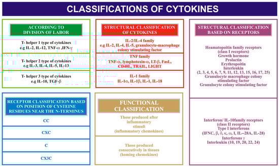Immune and non-immune cells of the human body produce low molecular weight glycoproteins, which are important regulators of the immune processes. Of glycoproteins, the cytokine group has gained attention primarily because of its critical role in regulating, signaling, maintaining and inducing most of the cellular interactions; they are hence regarded as molecular messengers [21]. The function of cytokines includes inflammation, apoptosis, host resistance, hematopoietic, and immunological responses, amongst many others. Characteristic features of cytokines include pleiotrophism i.e., they have the ability to interact not with one another but with other cellular targets, and cytokine crossover, i.e., a single cellular target can respond to multiple cytokines. They are chemotactic in nature, i.e., they attract particular cells via a concentration gradient. The doses of cytokines are generally maintained within a specified range and time. If not properly maintained, they can lead to induction of tissue damage. Cytokines can be classified according to the division of labour, on a structural basis and based on receptors (see Figure 1). Systemic conditions including obesity, psoriasis, anaphylactic shock, Steven-Johnson syndrome and other acute inflammatory conditions are known to increase the levels of cytokines several times over. Oral conditions, specifically oral aphthous ulcers, oral dysplastic lesions, oral and pharyngeal carcinomas and periodontitis, are known to contribute to elevated levels of cytokines as well.