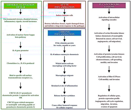 IL-8 is regarded as the prototype of the chemokine family. It is pro-inflammatory in nature and is released by the neutrophils and macrophages in response to various stimuli, including chemical environment, steroids, inflammatory signals and environmental stresses. These stimuli activate the nuclear factor-kappa-B (NF-κB) pathway and this, in turn, activates the expression of IL-8 production. The IL-8 produced acts on two structurally similar but antigenically different receptors, namely CRCX-1 and CRCX-2. These receptors are located on tumor-associated macrophages, neutrophils and cancer cells. The presence of the receptors on cancer cells strongly suggests that the levels of IL-8 are an important chemokine for cancer cells microenvironment [22]. The pathogenicity in cancer cells is derived from neutrophil recruitment, angiogenic potential, proliferation, survival, migration of vascular endothelial cells, protection from apoptosis and, ultimately, metastasis [23]. The role in cancer can also be postulated from the fact that treatment of cancerous lesions with chemotherapeutic agents like 5-fluorouracil, among many others, reduces the expression of IL-8 [18,24]. The stimulating agents, if removed or decreased, also alter the IL-8 expression and levels, which further provide confirmation. Moreover, Selvam et al. suggested salivary 1L-6 as a diagnostic marker for leukoplakia and OSCC by determining its concentration by enzyme-linked immunosorbent assay (ELISA), the results of which proved its high concentration and production by tumor cells [25]. Juretic et al. suggested and confirmed through ELISA the high levels of IL-6 and TNF-α, proving their diagnostic and prognostic significance in potentially premalignant lesions and conditions and in OSCC [26]. Nelson et al. suggested the elevation of IL-6, IL-8, IL-1 and TNF-α in oral neoplastic lesions and OSCC because of their characteristic feature involvement in pro-angiogenesis and pro-inflammation which, in turn, has diagnostic value [27].