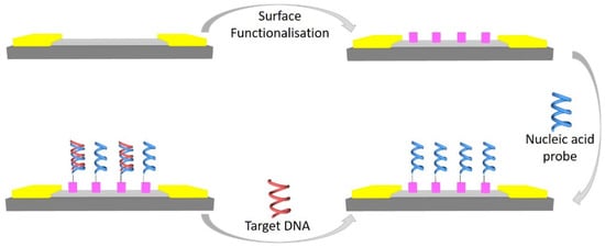 Nucleic acids such as deoxyribonucleic acid (DNA), ribonucleic acid (RNA), and microRNA (miRNA) play a major role in human physiology, and therefore they also play a major role in many diseases. As a result, rapid and highly sensitive detection methods of nucleic acid abnormalities or expression are considered extremely important for disease diagnosis [39]. G-FETs for DNA tend to be more sensitive and therefore more responsive to target analytes than the widely researched and developed ion-sensitive FET, which is attributed to the difference in the sensing mechanisms. Nucleic acids in close proximity with the graphene surface, whether physisorbed or through hybridization events, considerably change the graphene’s electronic properties by doping the graphene. This causes a direct change to the graphene’s properties. The standard bulk ion-sensitive FET, however, responds to changes in external charges, which cause a change in the channels’ capacitive properties [45]. In the case of nucleic acid-based biosensors, the biorecognition molecule is often a nucleic acid probe, as depicted in Figure 2.