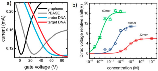 Over the past decade, several biosensor techniques have been developed for the high sensitivity detection of DNA. Several G-FET-based DNA biosensors have been developed using various sensing methods, including electrochemical [50], back-gated G-FETs [25], and liquid-gated G-FETs [45]. DNA-based G-FETs follow conventional DNA detection mechanisms. Short DNA oligomers (DNA probes) are used for biorecognition. DNA probes are short nucleotides which are complementary to the target DNA. These DNA probes are either immobilized to the sensor surface and act as a capture probe for the target DNA [38,51], or they are tagged and bound secondarily to target DNA captured on the sensor surface [50]. Alternatively, DNA can also be detected by physisorption, as the nucleobases which make up DNA are aromatic carbons, and thus are able to bind to the graphene via π-stacking [52]. Ping et al. demonstrated a scalable (>90% yield) back-gated G-FET DNA biosensor with 1 fM sensitivity for a 60-mer DNA. The G-FET was fabricated by transferring CVD-grown graphene onto a pre-fabricated SiO2 substrate with 45 nm thick Cr/Au contacts by an electrolysis bubbling method. Using a PBASE linker, the 22-mer DNA probe was attached to the graphene surface. It was reported that the Dirac peak of the graphene shifted increasingly at each stage of functionalization (highlighted in Figure 3) and furthermore with increasing DNA concentration. Ping et al. also confirmed the high selectivity of the probe by applying a single-nucleotide mismatched DNA strand and a non-complementary DNA strand. The application of the one-base mismatched DNA to the sensor resulted in a signal change only 12% of that of the complementary DNA [25].