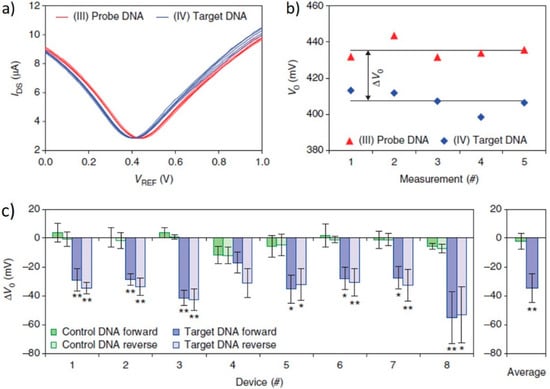(a) Dirac (Vg–IDS) curves for a single G-FET device before and after 100 fM miRNA target exposure. A total of five forward and reverse sweeps were performed on a single device. (b) VD values for each sweep calculated from the graphs depicted in (a). (c) ∆VD values noted for all eight G-FETs on exposure to the target DNA sequence and to the control DNA sequence. It can be noted that the response seen for the control DNA is considerably less than that caused by the target DNA. For the data highlighted here: * p < 0.05; ** p < 0.01, not significant. Adapted by permission from Macmillan Publishers Ltd.: [45], copyright 2014.