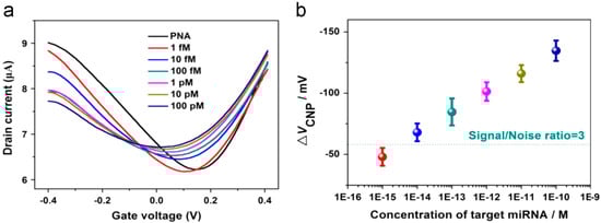 (a) The transfer curve of a G-FET decorated with AuNPs with immobilized PNA probe when exposed to increasing concentrations of Let7b miRNA. (b) It can be noted that VD progressively decreases in Vg due to an n-doping effect of the graphene by miRNA hybridization. Reprinted from [41], Copyright 2015, with permission from Elsevier