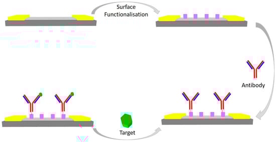 Immunoassays are biomolecular recognition tests commonly used to determine the presence of biomarkers in a solution and potentially quantify them. More specifically, immunoassays are analytical techniques which rely on biorecognition by antibody-antigen interactions. Therefore, the techniques are based on the specificity and affinity of the antibody for the respective antigen [57]. Immunosensors are developed by the immobilization of an antibody onto the G-FET’s surface. Detection then occurs when the target analyte binds to the antigen binding fragment of the antibody, as depicted in Figure 8. Many G-FETs for immunoassays have been reported in the literature [33,34,46,47].