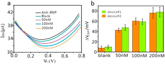 (a) Transfer curves of a PtNPs-decorated rGO-FET in response to brain natriuretic peptide (BNP) in whole blood samples which have been treated with a microfilter; (b) Dirac voltage shift in response to the differing concentrations of BNP. Adapted from [46], Copyright 2017, with permission from Elsevier.