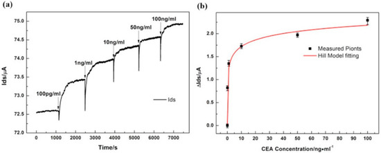 (a) Drain-source current response at the time-dependent introduction of various carcinoembryonic antigen (CEA) concentrations; (b) Drain-source current against CEA concentration fitted based on Hill adsorption model. Adapted from [47], Copyright 2017, with permission from Elsevier.