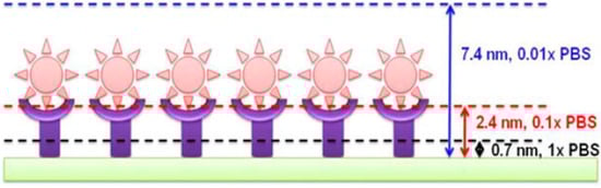 Even though many immuno-based sensors have been reported in the literature, it is still challenging to reach ultra-high sensitivities because of Debye–Hükel screening [52]. Debye–Hükel screening is a phenomenon caused by the solution’s interaction with the sensor [17]. Ionic solutions effectively screen the charge of analytes in proximity with the sensor surface by forming an electron double-layer. The length at which the analyte is able to be screened, otherwise known as the Debye screening length (λD), is highly dependent on buffer concentration [52]. Therefore, immunoFET detection is essentially limited to interactions which occur within a small distance of the electrode surface. Molecules outside of the λD are generally unable to be detected, as the charges within the graphene channel are unaffected [58]. As depicted in Figure 11, the λD decreases with increasing buffer concentration [17]. The Debye screening phenomenon makes it difficult to develop a highly sensitive immunosensor, as high ionic strength buffer solutions are required for biological species, therefore decreasing the λD, and making it difficult to use antibodies as the capture molecule [52].