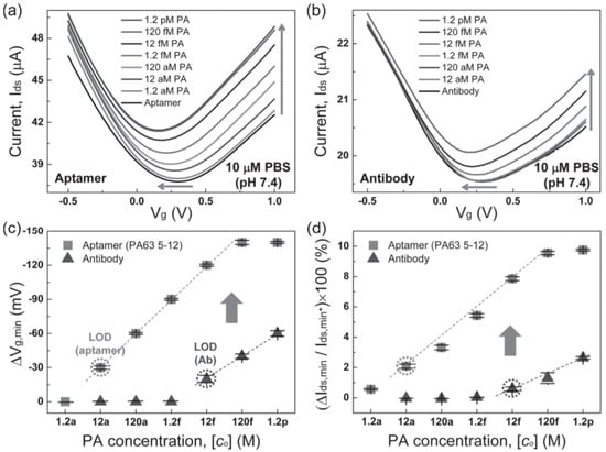 Transfer curves of a G-FET with increasing concentrations (depicted by the arrows) of protective antigen (PA) using an (a) aptamer and (b) antibody. These were then depicted as (c) Dirac voltage shift and (d) change in drain-source current. Reprinted from [48], Copyright 2013, with permission from John Wiley and Sons.