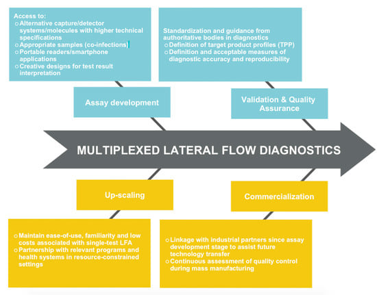 Arguably the most difficult hurdles to overcome lie in validation, commercial translation and quality assurance of any multiplex LFA device that shows promise in the laboratory or research scale. Furthermore, validation of diagnostic accuracy and reproducibility will require judicious study designs, and critically so, access to single-infection and co-infection patient samples and appropriate control samples. Where single-test assays could utilize the coefficient of variation (CV) (ratio of the standard deviation to the mean average) as a measure of intra- and inter-assay variability, it remains questionable whether the CV is still usable for multiplex tests, as well as the range of values of acceptable precision or inaccuracy. Validation studies of other platforms such as multiplex chemiluminescent immunoassays suggest that while intra-assay CVs for multiplex may be comparable with single ELISAs, inter-assay CVs indicate higher variability between the multiplex assays [,]. Recommendations recently exist for validation of multiplex tests in drug development [], with considerations for construction of a biomarker work plan, the number of analytes in one test, and the alignment of statistical acceptability criteria with intended use, and clinical, biological, and epidemiological relevance of analyte(s). While these recommendations may be applicable for diagnostic applications, developers may rely on authoritative bodies in diagnostics such as the Foundation for Innovative New Diagnostics (FIND) and PATH and regulatory bodies such as the Food and Drug Administration (FDA) to address the many uncertainties with regards to ascertaining diagnostic accuracy and reproducibility. Figure 1 highlights the factors that may promote efforts towards successful development and translation of a multiplexed LFA.