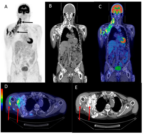 The maximum intensity projection (MIP) of the 18F-Fludeoxyglucose (18F-FDG) positron emission tomography (PET) image in the anterior view (A) showing multiple lesions with high 18F-FDG uptake located on the right side of the neck, around the right shoulder, and in the right axillar region (black arrows). A coronal computed tomography (CT) image (B) and a fused coronal image (C) of the head, neck, and upper body showing the same regions with high 18F-FDG uptake seen in the anterior view (A). Fused transversal images (D) and transversal CT images (E) showing the intramuscular high 18F-FDG uptake in the right axillary region (red arrows).