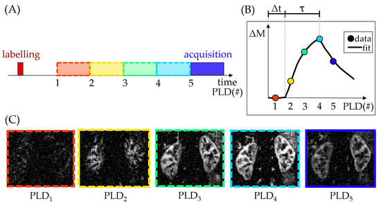 Multiple post-labeling delay (multi-PLD) ASL experiment (data acquired at a field strength of 1.5T). The schematic shows arbitrary PLDs. The actual PLDs used to acquire the ASL data in this figure were (in seconds): 0.1, 0.5, 0.9, 1.3, 2.7. (A) Simplified diagram of a multi-PLD acquisition. Note that after labeling, only one PLD image/volume is acquired at a time (in this case, 5 acquisitions would be necessary, each at different PLD); (B) Difference signal (ΔM) at each PLD and corresponding fit, highlighting parameters beyond renal blood flow (Δt and τ); (C) Difference image at each PLD.