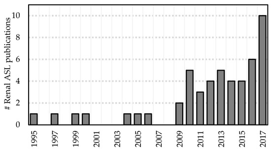 Renal ASL has recently become a more active area of research, with approximately 30 studies published in the last five years (see Figure 3). Commensurate developments have been described in the literature. For the purposes of this review, these developments can be categorized as methodological developments and emerging clinical applications.