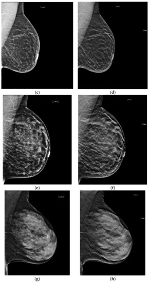 The four categories of breast density on conventional 2D FFDM and synthesized mammography. (a) Predominantly fatty breast 2D FFDM (b) Predominantly fatty breast s2D FFDM (c) Scattered fibroglandular breast 2D FFDM (d) Scattered fibroglandular breast s2D (e) Heterogeneously dense breast 2D FFDM (f) Heterogeneously dense breast s2D (g) Extremely dense breast 2D FFDM (h) Extremely dense breast s2D.