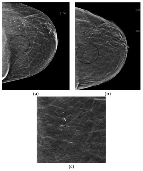 Linear, heterogeneous calcifications (circled in black) best seen on synthesized mammography images (grade 2 ductal carcinoma in situ). (a) 2D FFDM (b) s2D (c) s2D zoom.