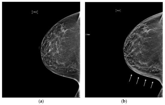 Bright band artifact (indicated by arrows) can be seen along the curvature of the medial breast on synthesized mammography. (a) 2D FFDM (no artifact) (b) s2D with Bright band artifact.
