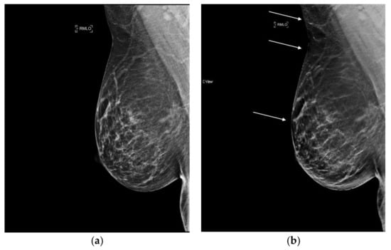 Loss of skin resolution or “skin burnout” (indicated by arrows) can be seen on synthesized mammography. (a) 2D FFDM (no artifact) (b) s2D with skin burnout artifact.