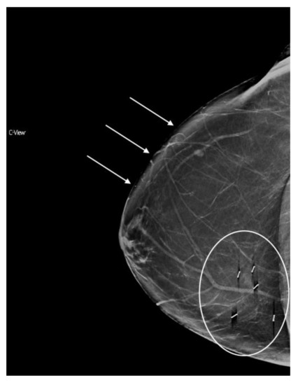 “Slinky”/shadowing clip artifact (circled) and skin burnout (arrows) on synthesized mammography.