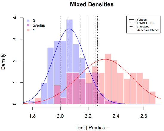 In the case of quantitative tests, a smaller or larger part of the overlap between the distributions for subjects with and without the targeted disease can be interpreted as uncertain (Figure 1). Tests that have no overlap and diminish the uncertainty to zero are extremely rare [2]. All three methods discussed here define a larger or smaller interval of the overlapping test scores that are considered diagnostically insufficient and unsuitable for a decision for or against the targeted disease. To the best of my knowledge, these three methods are currently the only ones to define a range of uncertain test scores. There is an alternative three class method, but this method is directed to the specific context of disease states when the identification of more than two classes is relevant and is not concerned with identifying a middle category of uncertain test scores [16,17].
